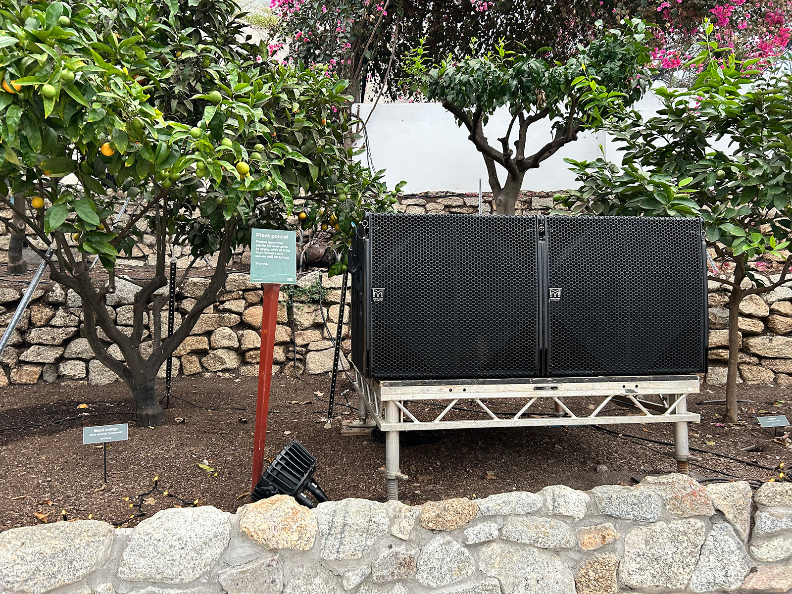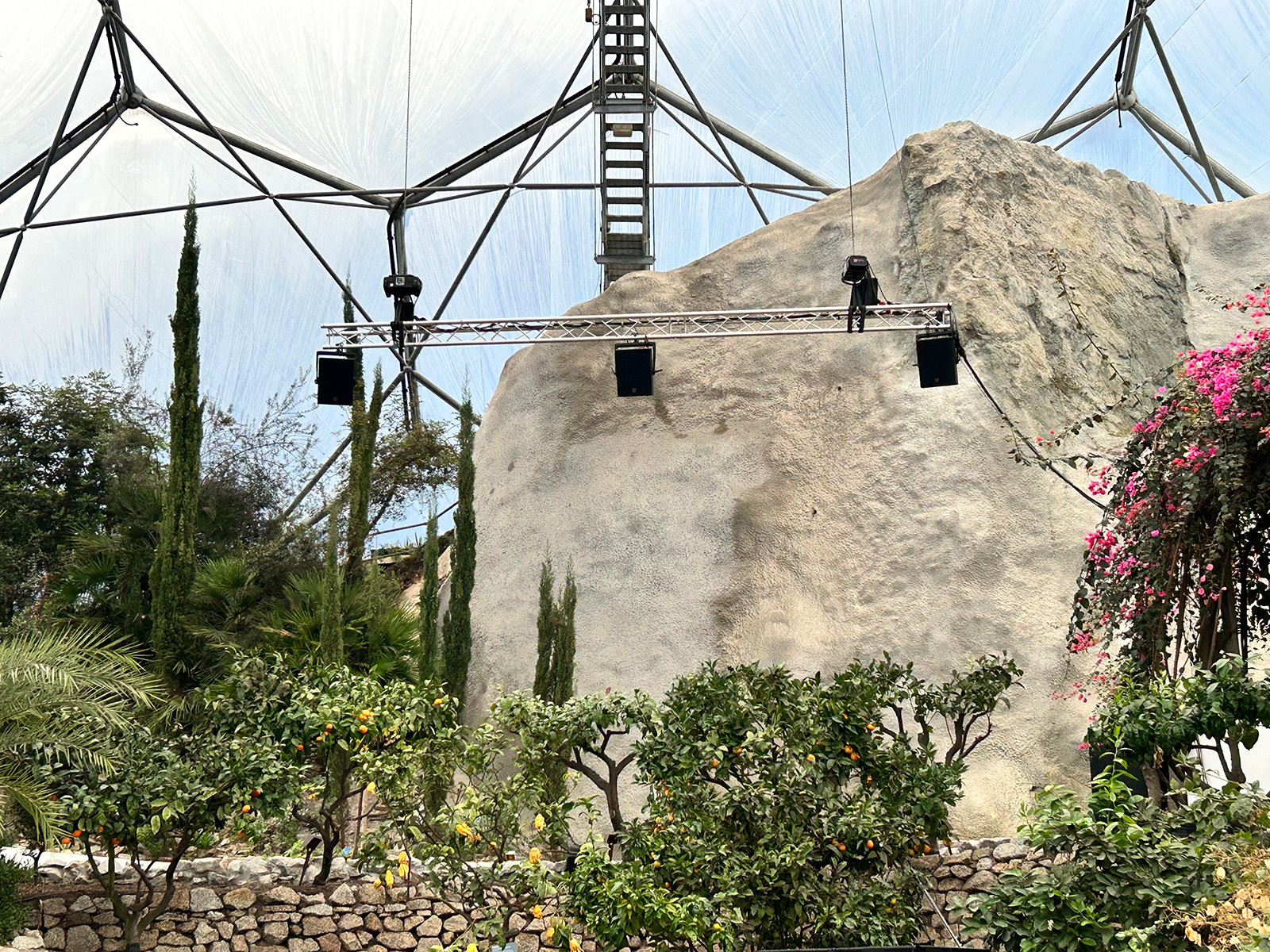 With the idea pitched successfully to the Eden Project, TruCru worked with the TiMax team to redesign the available rental inventory for a spatial delivery. The loudspeaker layout combined multiple layers of Martin Audio FlexPoint loudspeakers – FP12s flown at height, with more FP12’s positioned wide-left and right, concealed within planting, with further speakers positioned around the audience zone. Additional FP8 ceiling points were integrated where biome load limits allowed, ensuring vertical energy and a sense of expansiveness across the space.